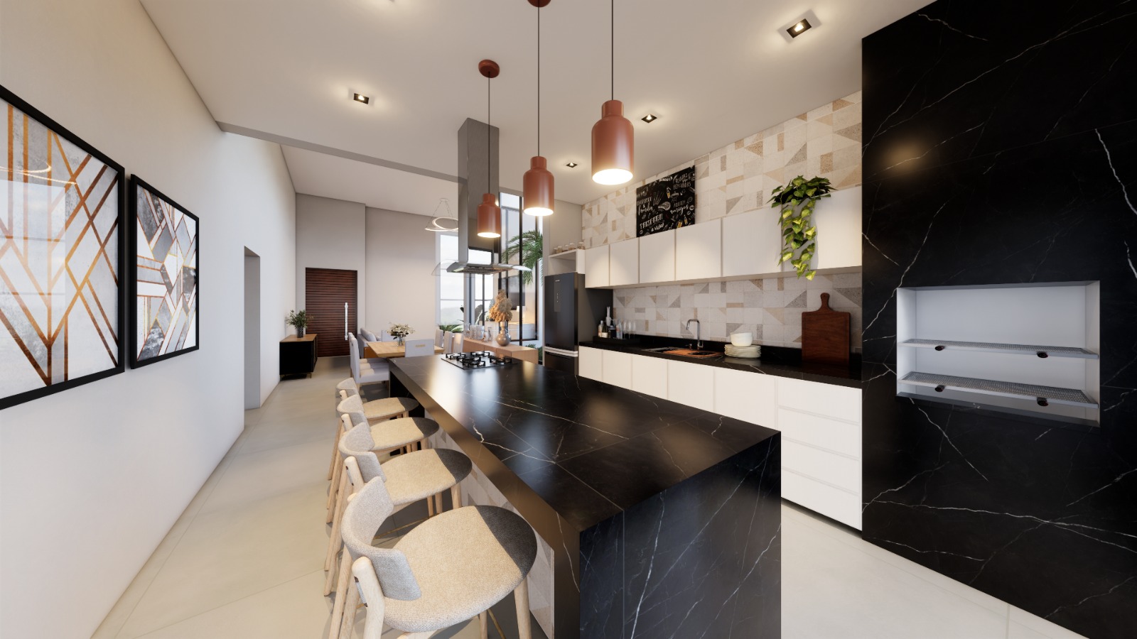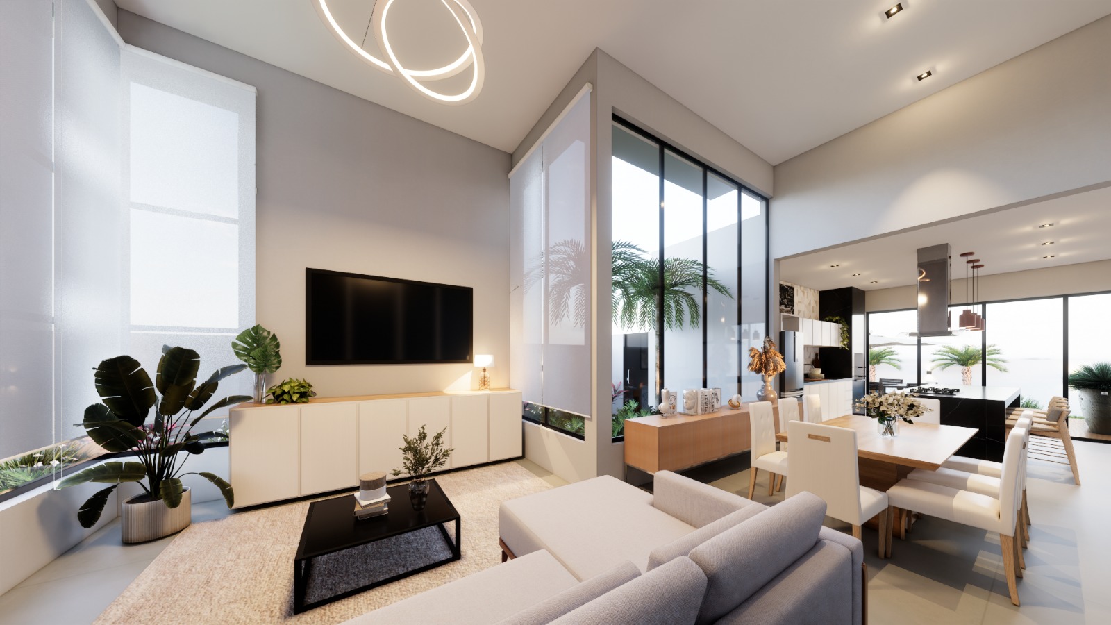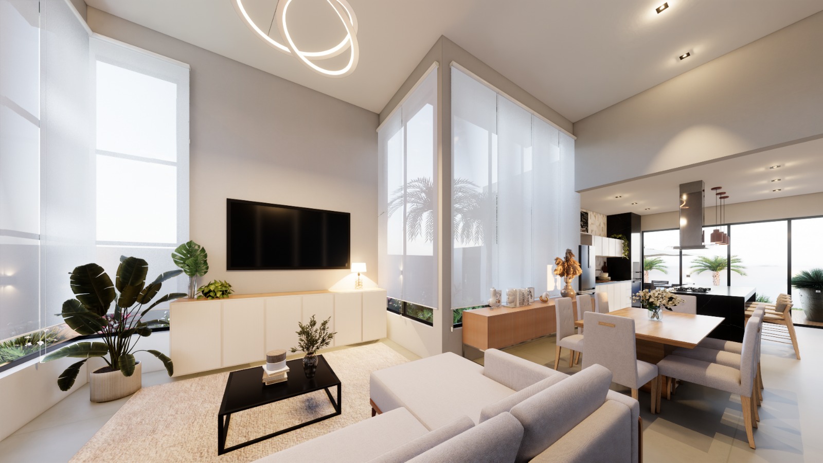 Os ambientes foram pensados para proporcionar fluidez e amplitude, com pé-direito alto e grandes esquadrias que integram sala de TV, sala de jantar, cozinha gourmet e área externa em perfeita harmonia.