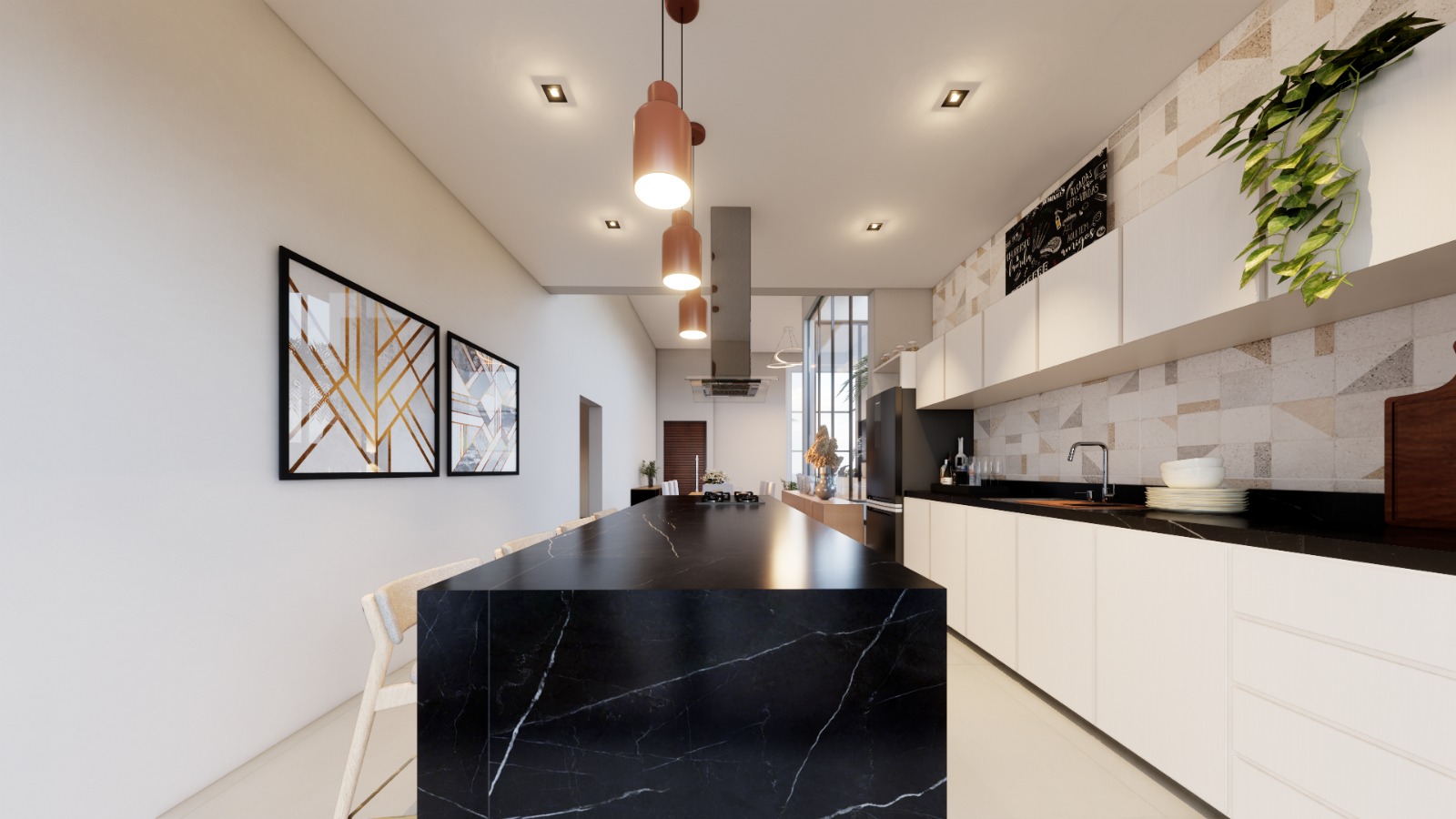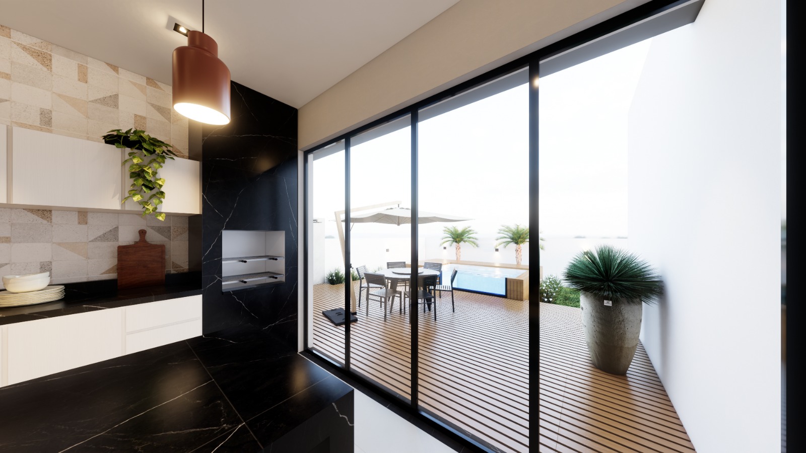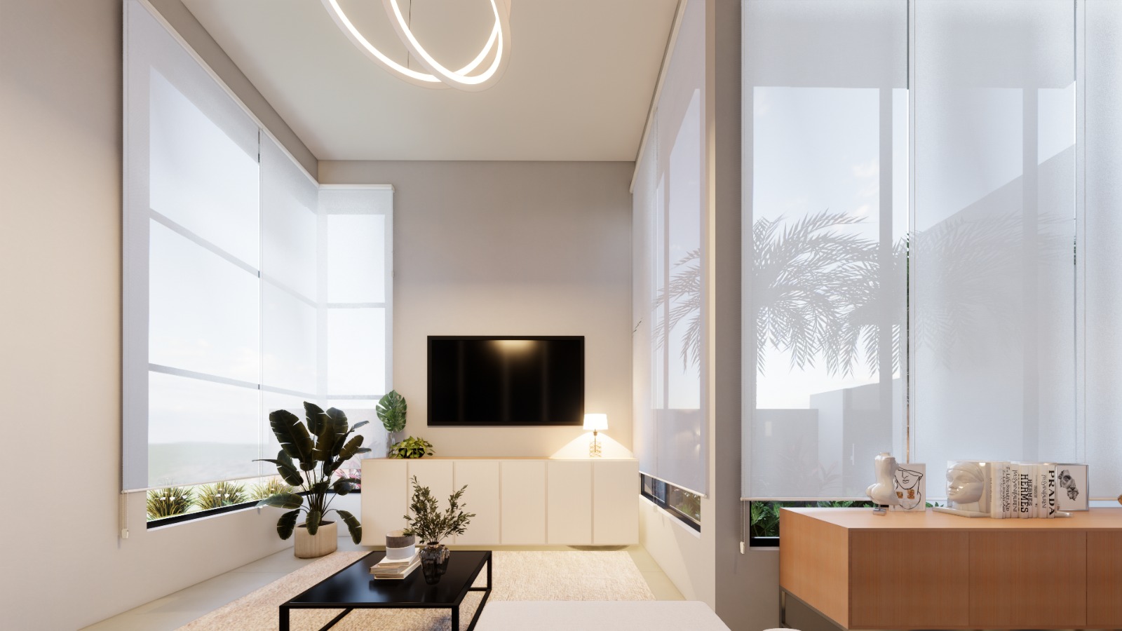 Os ambientes foram pensados para proporcionar fluidez e amplitude, com pé-direito alto e grandes esquadrias que integram sala de TV, sala de jantar, cozinha gourmet e área externa em perfeita harmonia.