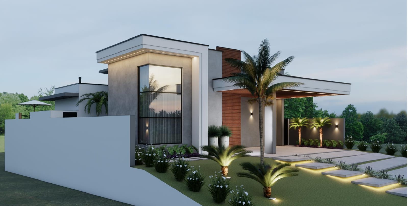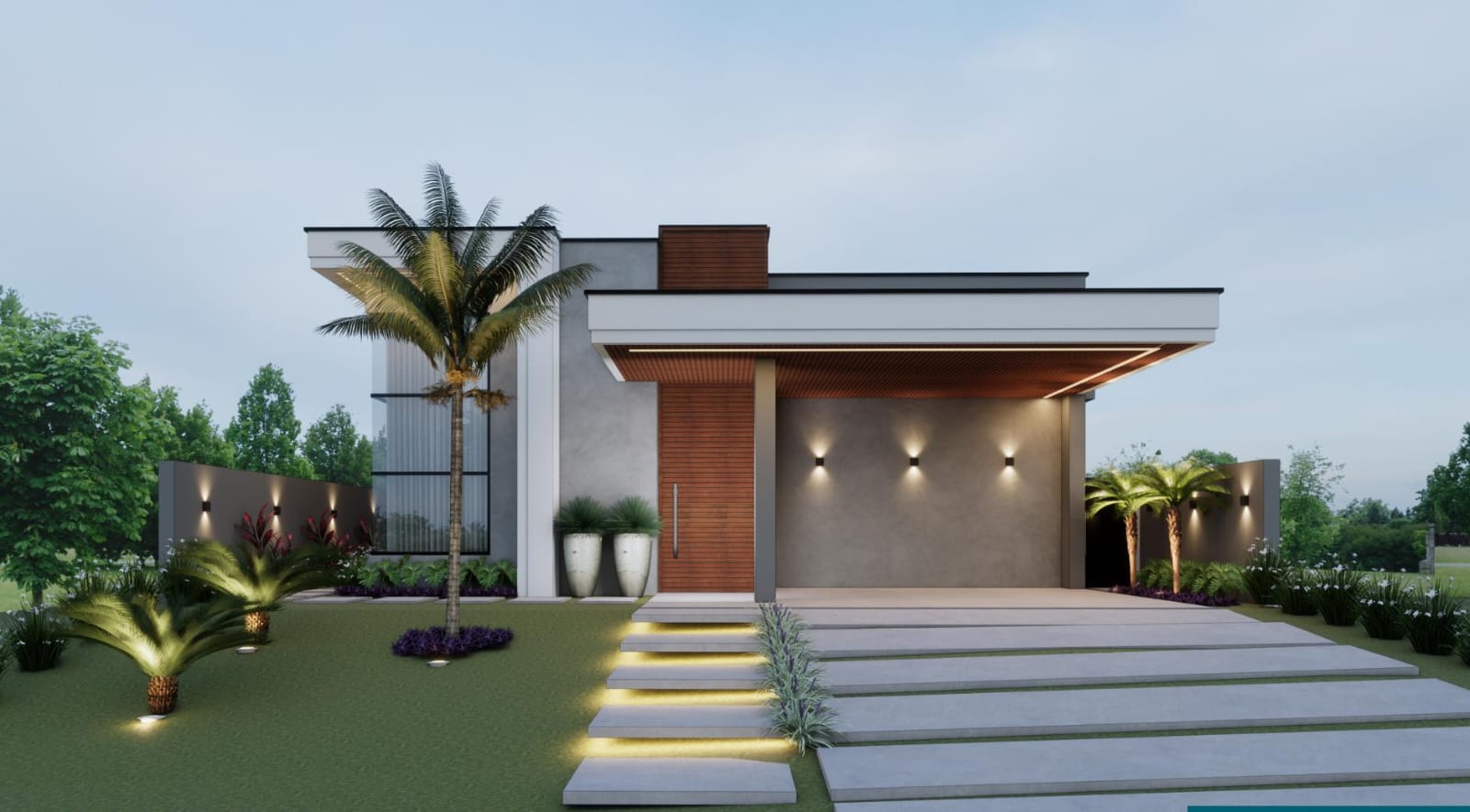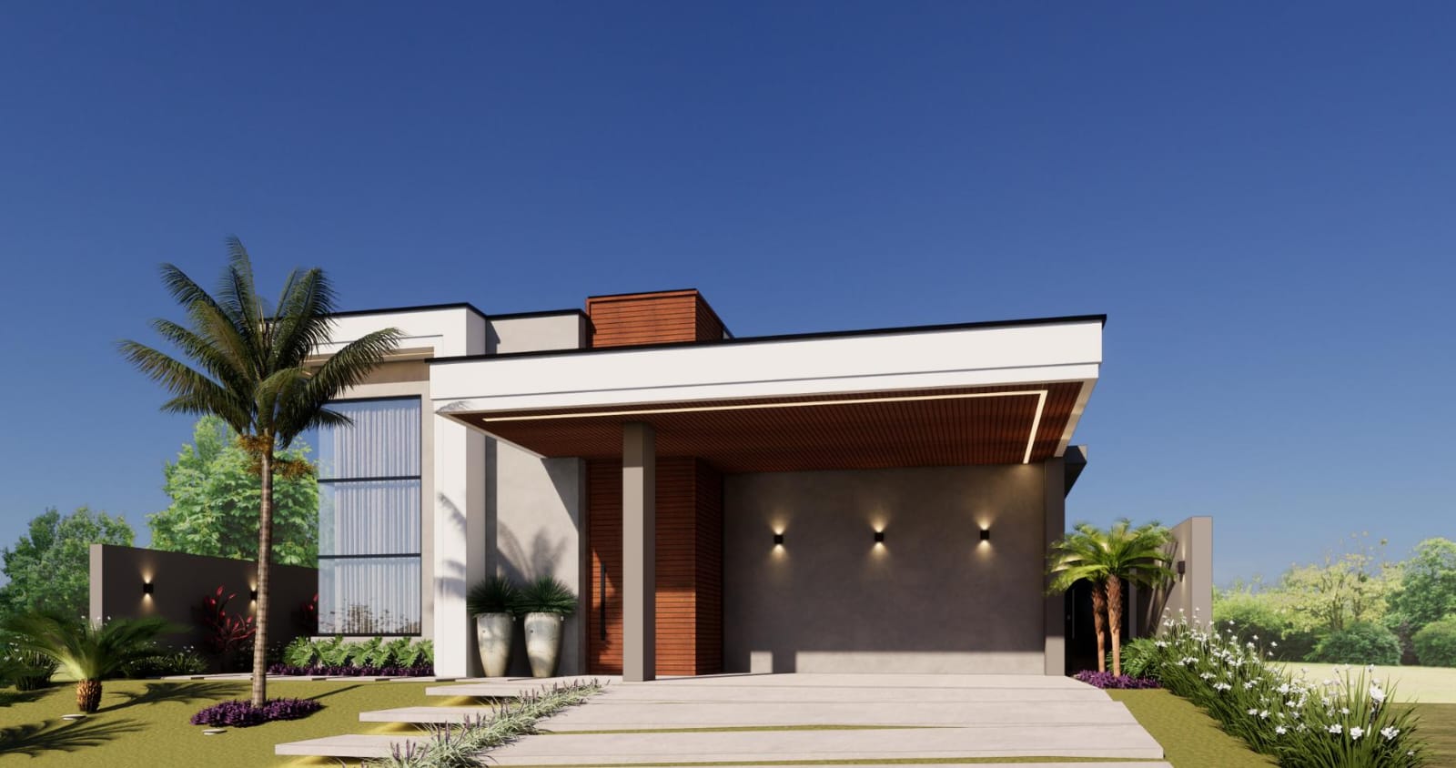 Desde a entrada, a imponência da pedra moledo e o pórtico em madeira ripada revelam uma fachada moderna, com volumetria elegante e paisagismo tropical, criando uma primeira impressão marcante e acolhedora.