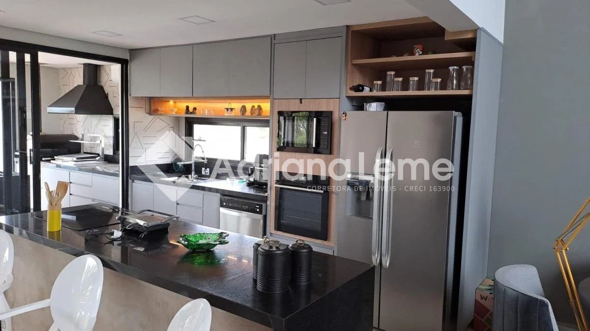 Cozinha completa, equipada com geladeira side by side, torre quente, cooktop e lava-louças.